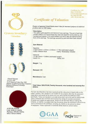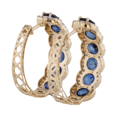 Sapphire and Diamond hoop earrings with round Natural Blue Sapphires totalling 7.76ct and round Natural Diamonds totalling 0.68ct (FSA estimated grading: HiJ SI-P1). 14ct yellow gold with white rhodium plating. Hoop diameter: 2.6cm. Hoop width: 7.8mm. Weight: 7.0g. With Valuation Certificate dated 01/08/2024.