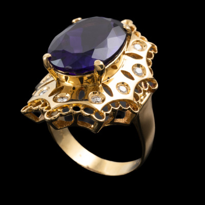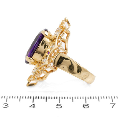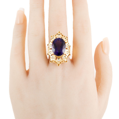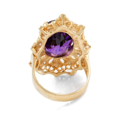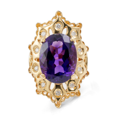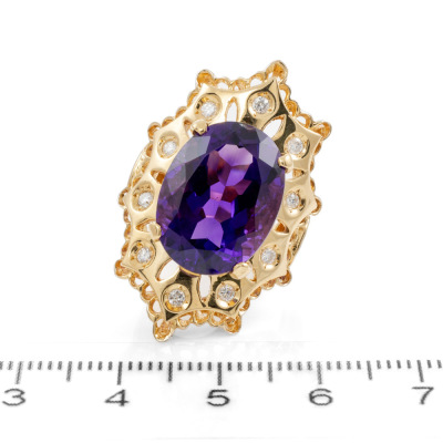 Amethyst and Diamond ring with oval shape Natural Amethyst of 7.85ct and round Natural Diamonds totalling 0.20ct. 18ct yellow gold. Ring size N1/2. Weight: 10.9g. (Pre-owned)