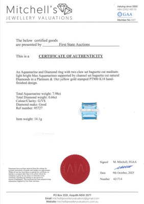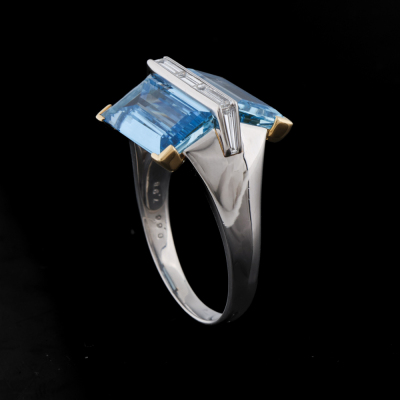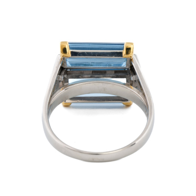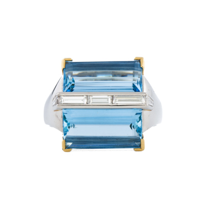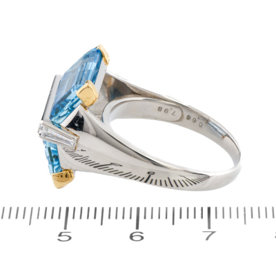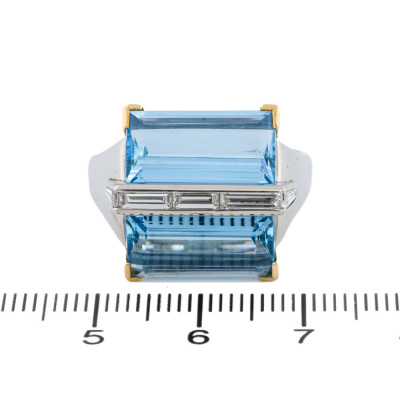 Aquamarine and Diamond ring with 2 baguette cut Natural Aquamarines totalling 7.98ct and 5 baguette cut Natural Diamonds totalling 0.66ct (Estimated grading: G VS). Platinum-900 and 18ct yellow gold. Ring size S 3/4. Band width: 2.5mm - 4.6mm. Weight: 14.1g. With Certificate #421714. (Pre-owned)
