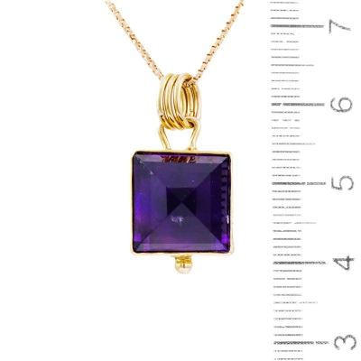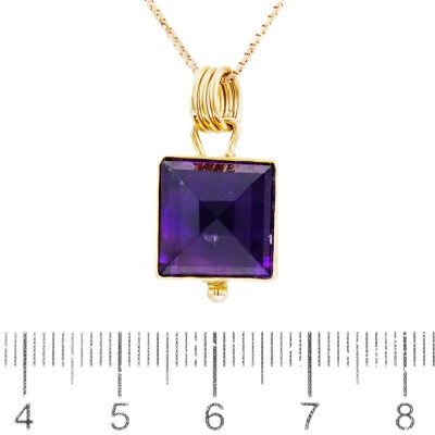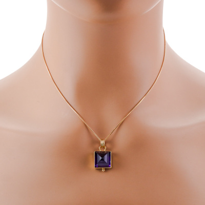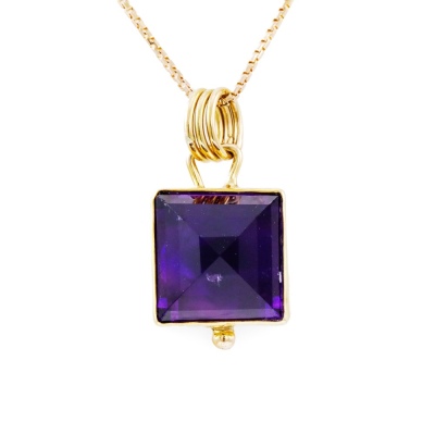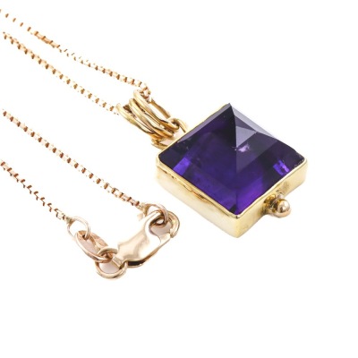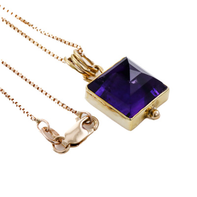 Amethyst pendant with pyramid cut Natural Amethyst of approximately 8.00ct. 18ct yellow gold with 39cm 14ct yellow gold chain. Weight: 6.90g (Pre-owned).