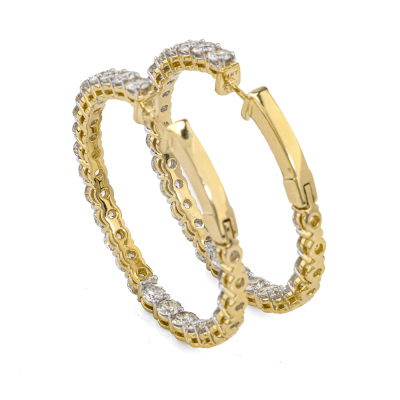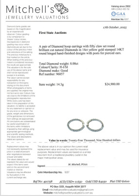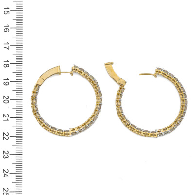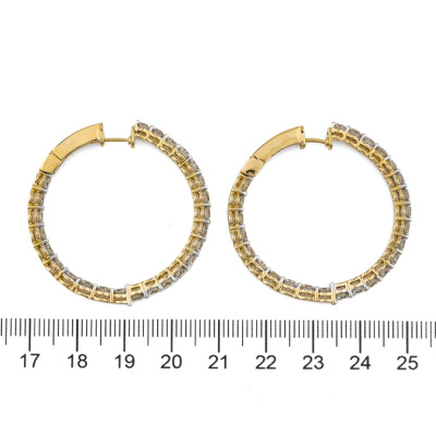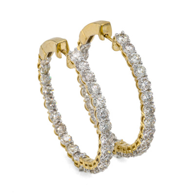 Diamond inside-out hoop earrings with 50 round Natural Diamonds totalling 8.00ct (Estimated grading: H-I SI). Back of the hoop has the Diamonds set inside the hoop. 14ct yellow gold. Diameter: 3.8cm. Hoop width: 3.5mm. Weight: 14.3g. With Valuation Certificate #421758. (New).