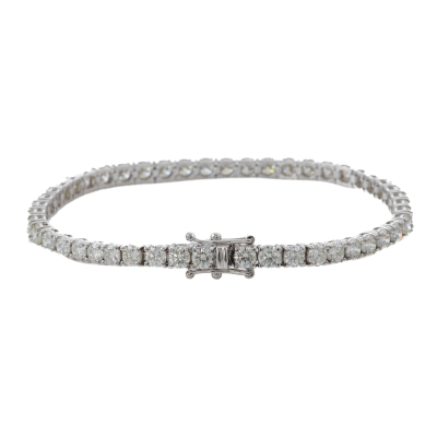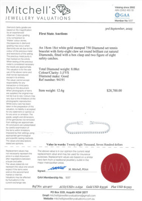 Diamond tennis bracelet with 48 round Natural Diamonds totalling 8.00ct (Estimated grading: I-J VS). 18ct white gold. Length: 18cm. Weight: 12.6g. With Valuation Certificate #421407. (New)