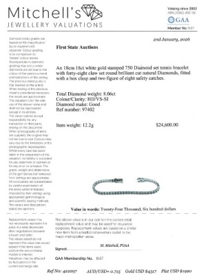 Diamond tennis bracelet with 48 round Natural Diamonds totalling 8.06ct (Estimated grading: HIJ VS-SI). 18ct white gold. Length: 18cm. Weight: 12.2g. With Valuation Certificate #4222297. (New)