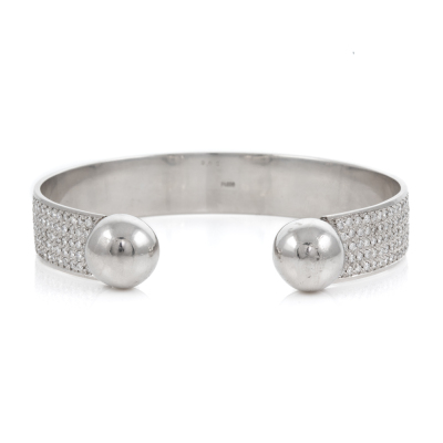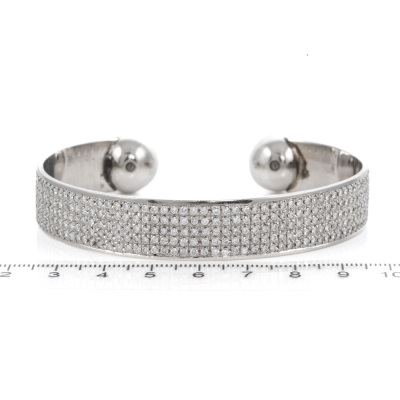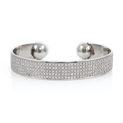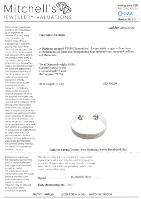 Diamond open bangle with round Natural Diamonds totalling 8.08ct (Estimated grading: H-I SI). Platinum-850. Inner circumference: 20cm. Width: 13.4mm. Weight: 111.2g. With Valuation Certificate #418139. Note - bangle with visible soldering mark. (Pre-owned)