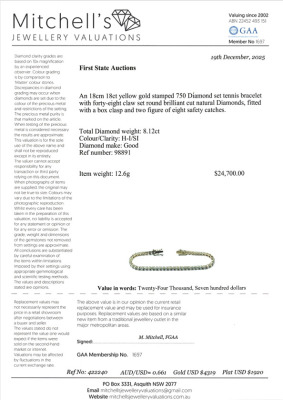 Diamond tennis bracelet with 48 round Natural Diamonds totalling 8.12ct (Estimated grading: H-I SI). 18ct yellow gold. Length: 18cm. Weight: 12.6g. With Valuation Certificate #422240.