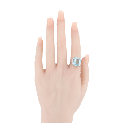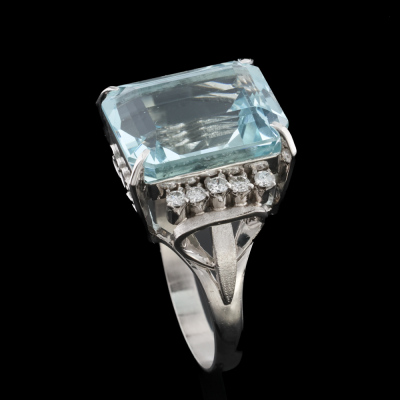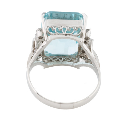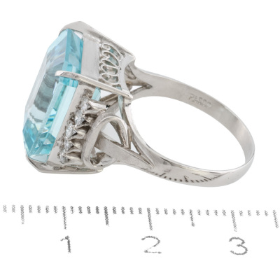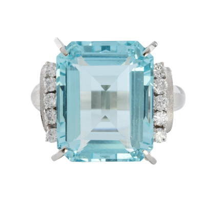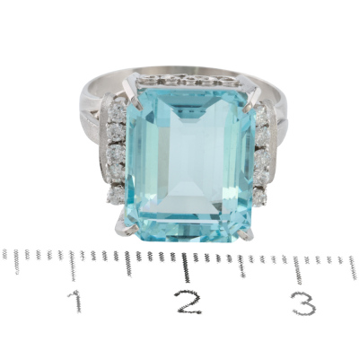 Aquamarine and Diamond ring with centre emerald cut Natural Aquamarine of approximately 8.20ct and 10 round Natural Diamonds totalling approximately 0.20ct. Platinum - 900. Ring size O1/4. Band width: 2.4mm - 2.8mm. Weight: 8.0g. (Pre-owned)