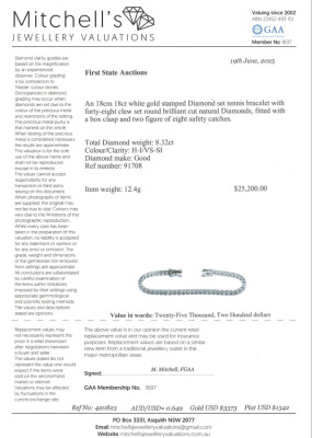 Diamond tennis bracelet with 48 round Natural Diamonds totalling 8.32ct (Estimated grading: H-I VS-SI). 18ct white gold. Length: 18cm. Weight: 12.4g. With Valuation Certificate #420823. (New)