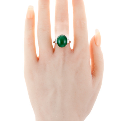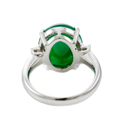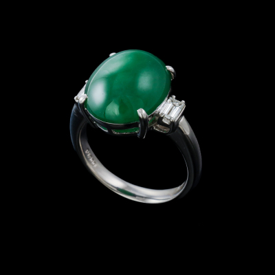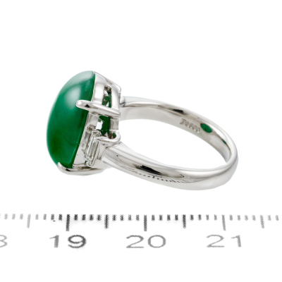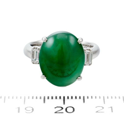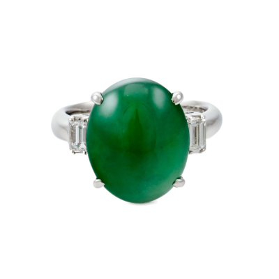 Jade and Diamond ring with oval cabochon cut Natural green Jadeite Jade - Type A of 8.45ct and 2 baguette cut Natural Diamonds totalling 0.31ct (Estimated grading: G-H VS). Platinum - 900. Ring size L. Band width: 2.9mm. Weight: 9.4g. (Pre-owned)