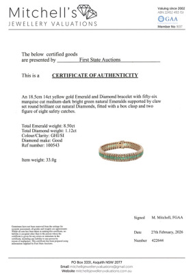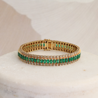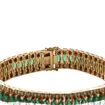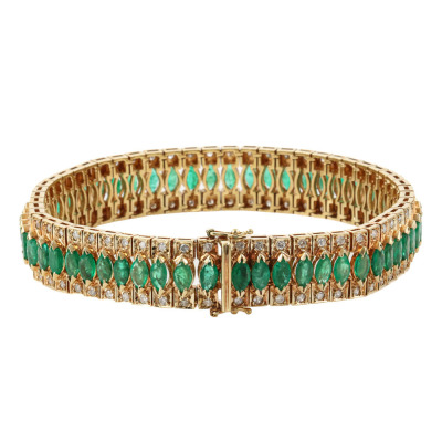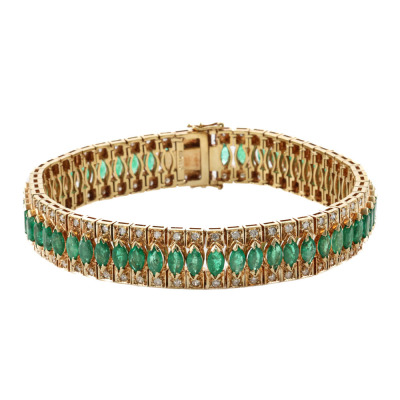 Emerald and Diamond bracelet with 56 marquise cut Natural Emeralds totalling 8.50ct and round Natural Diamonds totalling 1.12ct. (Estimated grading: GHI SI). 14ct yellow gold. Length: 18.5cm. Width: 1.1cm. Weight: 33.0g. With Certificate #422644.
