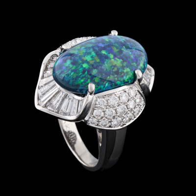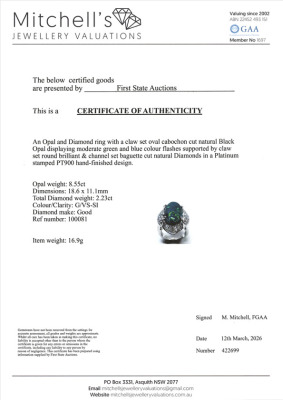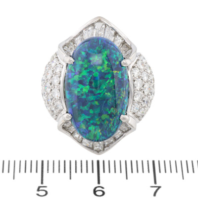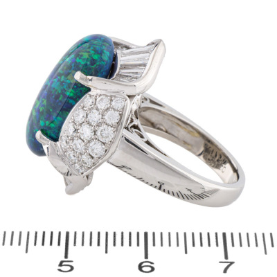 Opal and Diamond ring with centre oval cabochon cut solid Natural Black Opal of 8.55ct and round & baguette cut Natural Diamonds totalling 2.23ct (Estimated grading: G VS-SI). Platinum - 900. Ring size I3/4. Band width: 3.2mm - 4.2mm. Weight: 16.9g. With Certificate #422699.