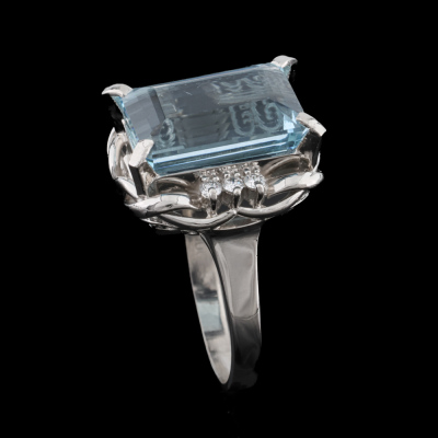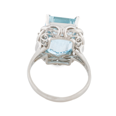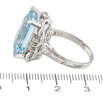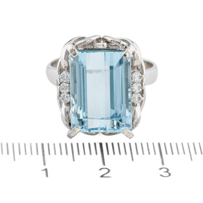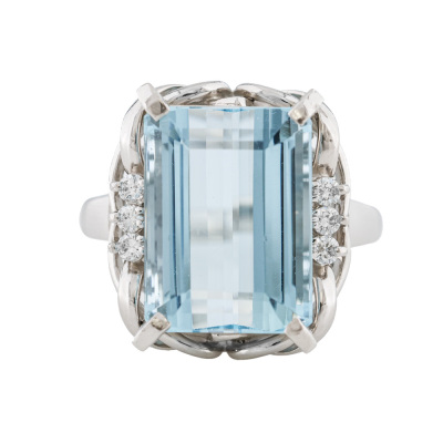 Aquamarine and Diamond ring with centre emerald cut Natural Aquamarine of 8.63ct and round brilliant cut Natural Diamonds totalling 0.14ct. Platinum - 900. Ring size O3/4. Band width: 2.1mm - 2.7mm. Weight: 9.3g. (Pre-owned).