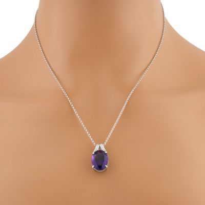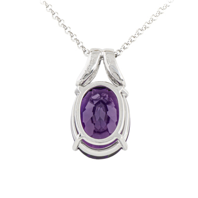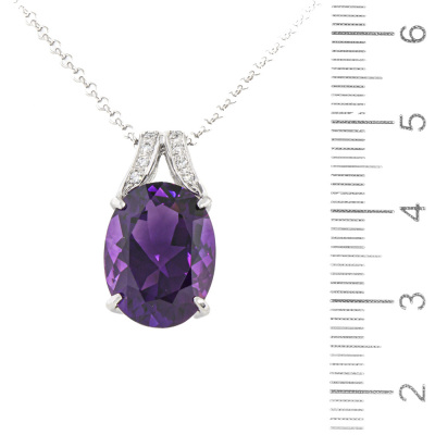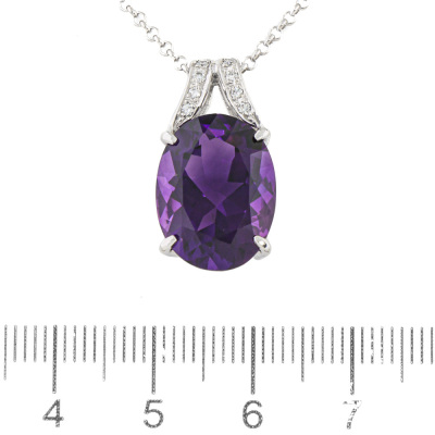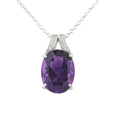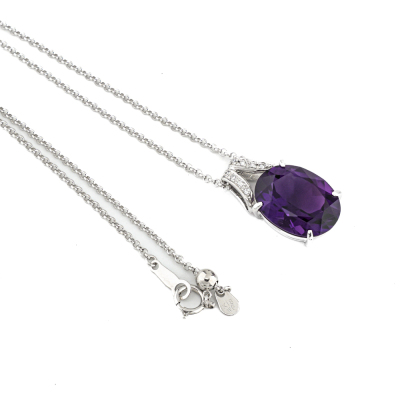 Amethyst and Diamond pendant with centre oval shape Natural Amethyst of 8.64ct and round Natural Diamonds totalling 0.08ct. 18ct white gold with 45cm 18ct white gold adjustable chain. Weight: 8.6g. (Pre-owned)