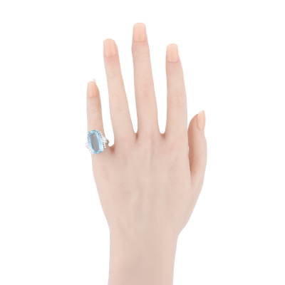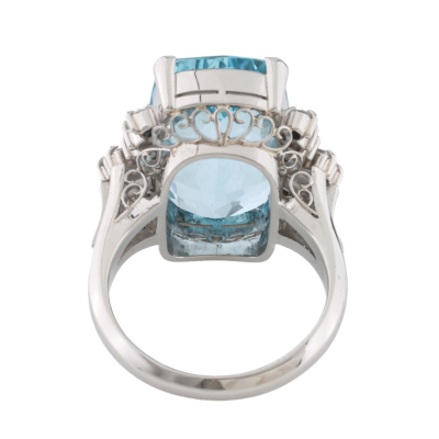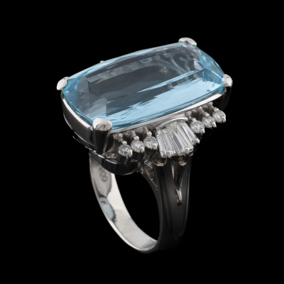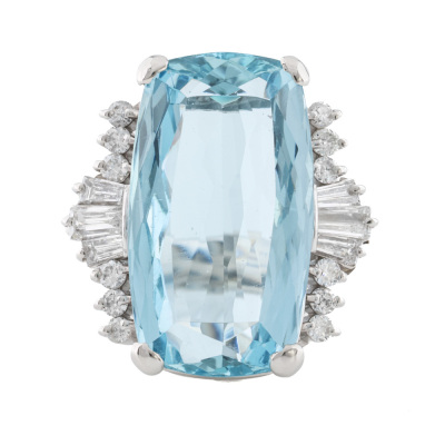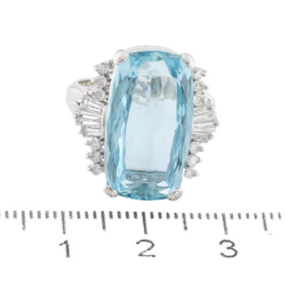Aquamarine and Diamond ring with centre cushion cut Natural Aquamarine of 8.70ct with round & baguette cut Natural Diamonds totalling 0.60ct (Estimated grading: H SI). Platinum - 900. Ring size I. Band width: 2.8mm - 3.8mm. Weight: 11.1g. (Pre-owned).