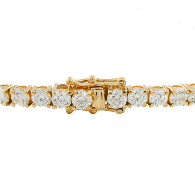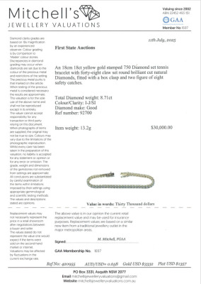 Diamond tennis bracelet with 48 round Natural Diamonds totalling 8.71ct (Estimated grading: I-J SI). 18ct yellow gold. Length: 18cm. Weight: 13.2g. With Valuation Certificate #420955. (New)