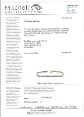 Diamond tennis bracelet with 48 round Natural Diamonds totalling 8.71ct (Estimated grading: I-J SI). 18ct yellow gold. Length: 18cm. Weight: 13.2g. With copy of Valuation Certificate #420955. (Pre-owned)