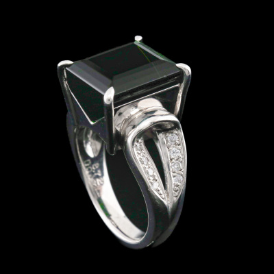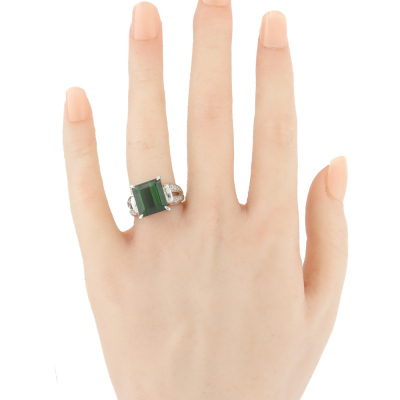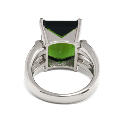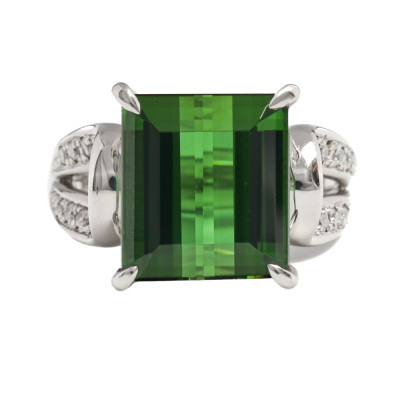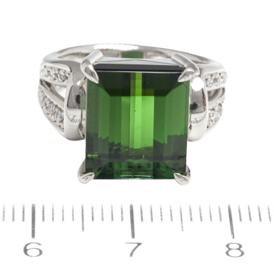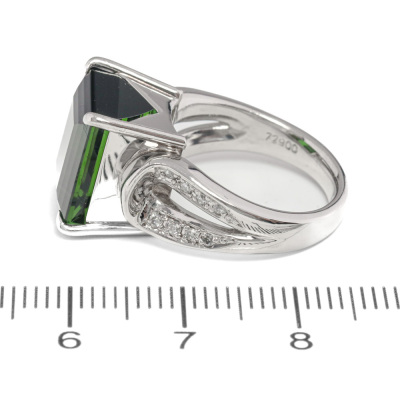 Tourmaline and Diamond ring with centre emerald cut Natural Green Tourmaline of 8.72ct and 16 round Natural Diamonds totalling 0.17ct. Platinum - 900. Ring size K1/4. Band width: 3.2mm - 4.2mm. Weight: 14.1g. (Pre-owned)