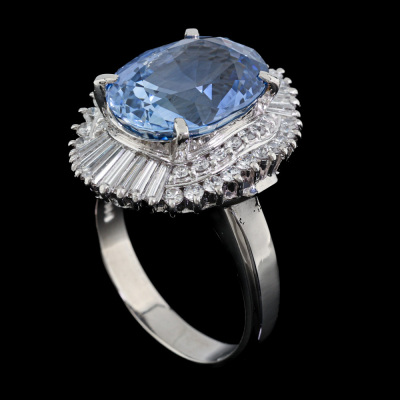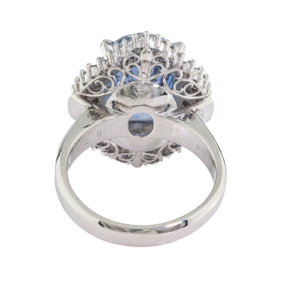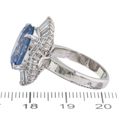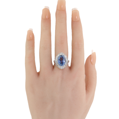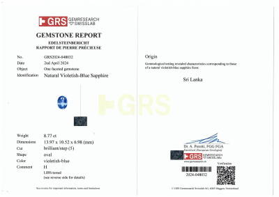 Sapphire & Diamond ring with oval shape Natural Sri Lankan Violetish-Blue Sapphire of 8.77ct (With GRS Report #GRS2024-048032) and round and baguette cut Natural Diamonds totalling 1.04ct (Estimated grading: H SI). Platinum - 900. Ring size M. Band width: 3.2mm - 3.7mm. Weight: 13.8g. (Pre-owned).