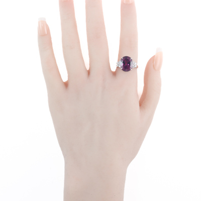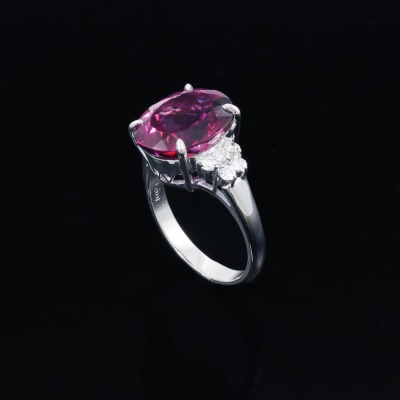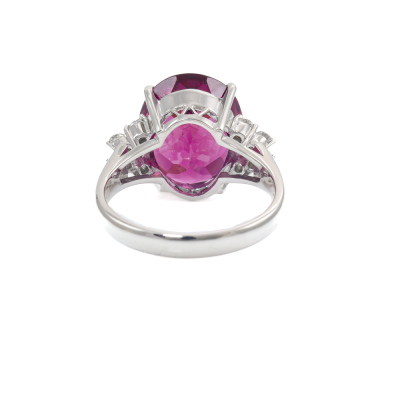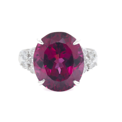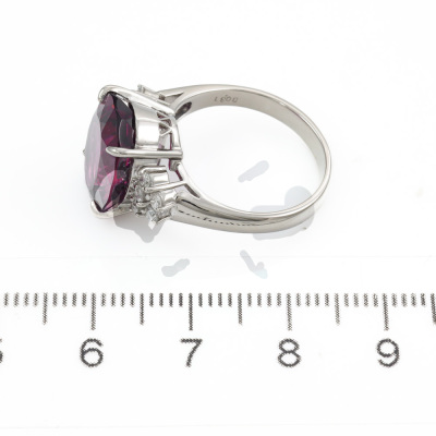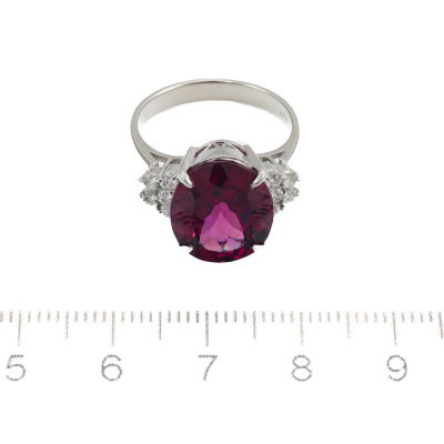 Rhodolite and Diamond ring with oval shape Natural Rhodolite of 8.78ct and round Natural Diamonds totalling 0.31ct (Estimated grading: H VS-SI). Platinum - 900. Ring size M. Band width: 2.7mm - 3.5mm. Weight: 8.2g. (Pre-owned)