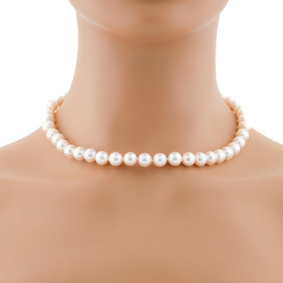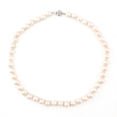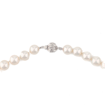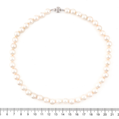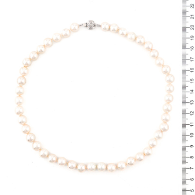 Pearl necklace with Akoya Pearl from 8.8mm - 8.5mm. 14ct white gold 9mm ball clasp. Length: 43.5cm. Weight: 43.8g. (As New)