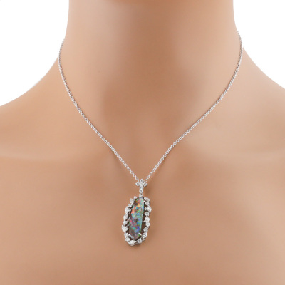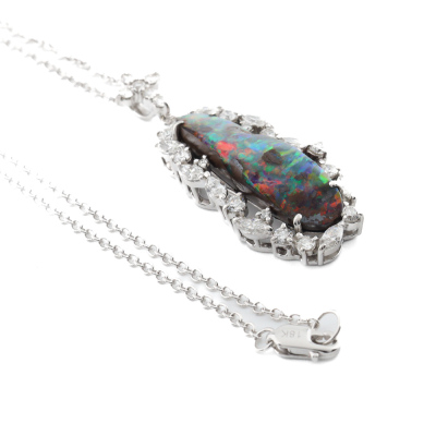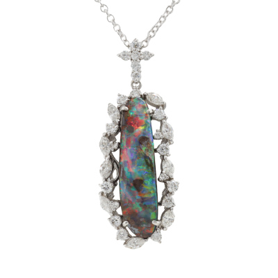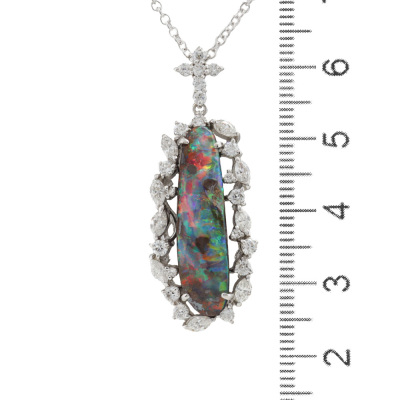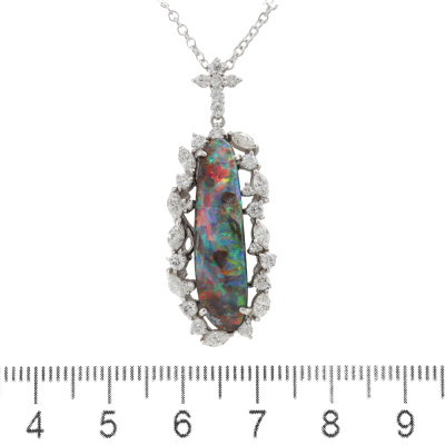 Opal and Diamond pendant with oval shape Natural Opal of 8.83ct and round & marquise cut Natural Diamonds totalling 1.32ct (Estimated grading: G-H VS-SI). Platinum - 900 and 18ct white gold 40.0cm chain. Weight: 9.3g. (Pre-owned)