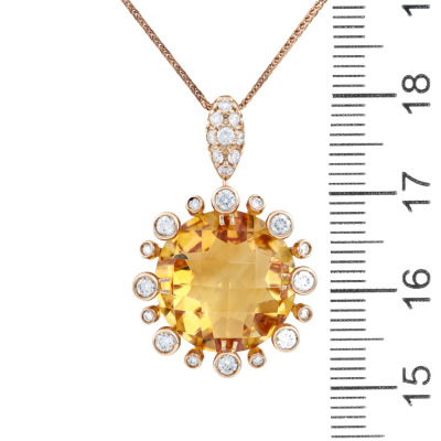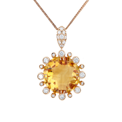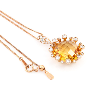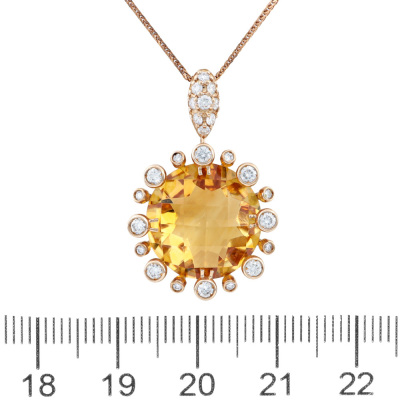 Citrine and Diamond pendant with centre round checkerboard cut Citrine of 8.93ct and round Natural Diamonds totalling 0.45ct (Estimated grading: H-I SI-P1). 18ct rose gold with 45.5cm adjustable 18ct rose gold chain. Weight: 6.9g. (Pre-owned)