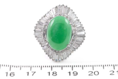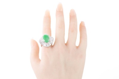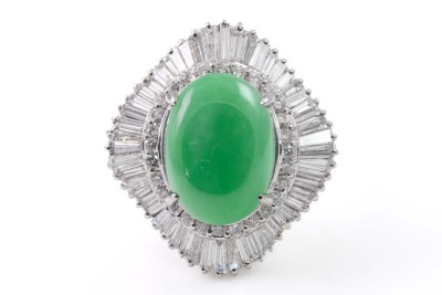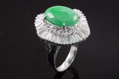 Jade and Diamond ring with cabochon cut oval shape Natural Jadeite Jade - Type A of 9.02ct and round & baguette cut Diamonds totalling 2.81ct (Estimated grading: G-H SI-P1). Platinum-900. Ring size O. Weight: 20.2g. With certificate #417141. (Pre-owned)