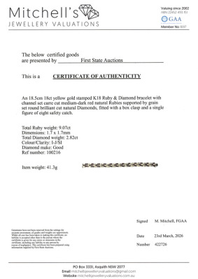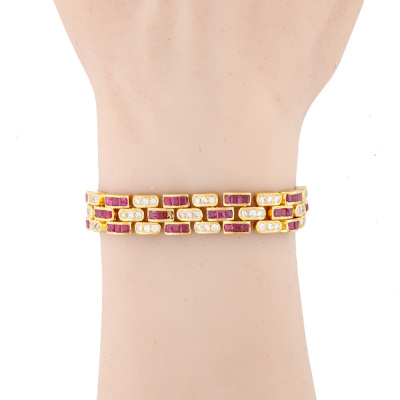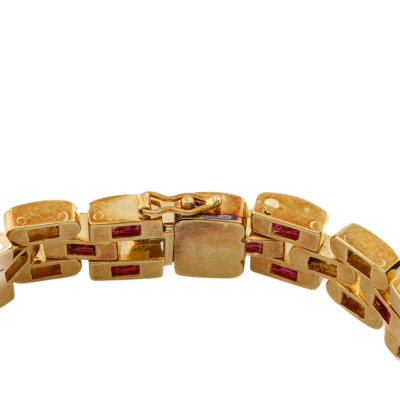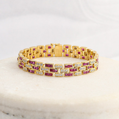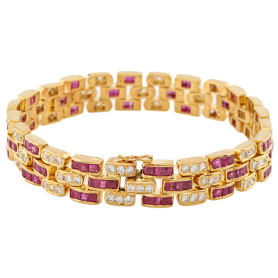 Ruby and Diamond bracelet with carre cut Natural Rubies totalling 9.07ct and round Natural Diamonds totalling 2.82ct (Estimated grading: I-J SI). 18ct yellow gold. Length: 18.5cm. Width: 10.2mm. Weight: 41.3g. With Certificate #422726.