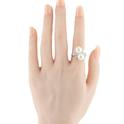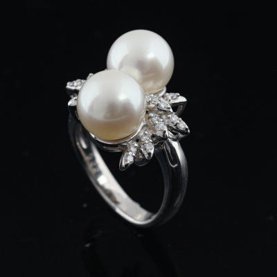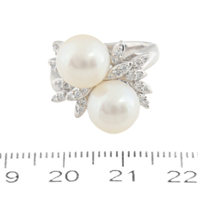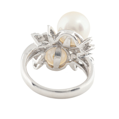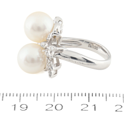 Pearl and Diamond ring with 2 South Sea Pearl approximately from 9.1mm - 9.2mm and round Natural Diamonds totalling 0.22ct. Platinum - 900. Ring size K1/2. Band width: 3.1mm - 3.3mm. Weight: 10.4g. (Pre-owned)