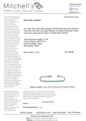 Diamond tennis bracelet with 45 round Natural Diamonds totalling 9.10ct (Estimated grading: HIJ VS-SI). 18ct white gold. Length: 18cm. Weight: 13.2g. With Valuation Certificate #422322.