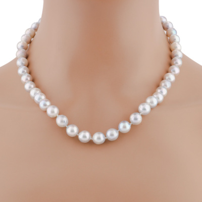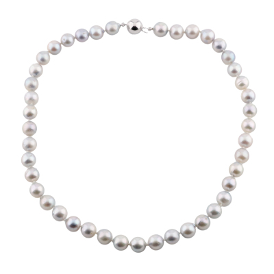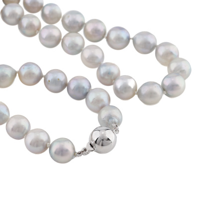 Pearl strand necklace with silver South Sea Pearls from 9.4mm - 9.0mm. With 14ct white gold ball clasp. Length: 46.5cm. Weight: 49.9g. (As New)