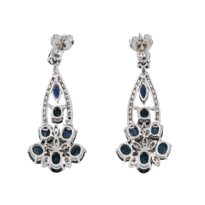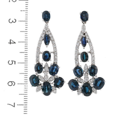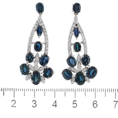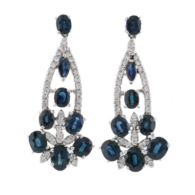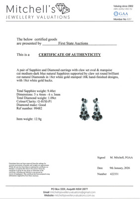Sapphire and Diamond earrings with oval & marquise cut Natural Blue Sapphires totalling 9.40ct and round Natural Diamonds totalling 1.09ct (Estimated grading: GH SI-P1). 18ct white gold. Length: 4cm. Weight: 12.9g. With Certificate #422331. (pre-owned)