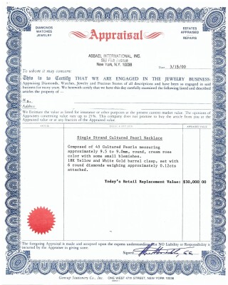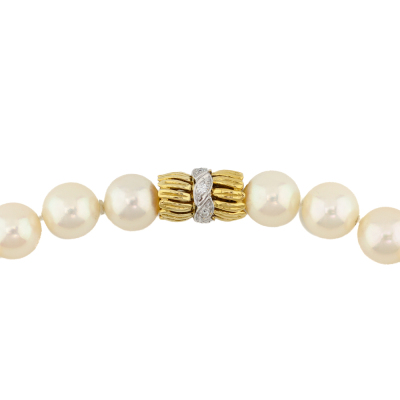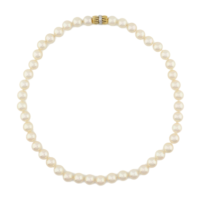 Pearl strand necklace with 45 cultured Pearls from 9.5mm - 9.0mm. 18ct yellow & white gold barrel clasp set with 6 round Natural Diamonds totalling 0.12ct. Length: 47cm. Weight: 54.1g. With Appraisal dated 15/03/00.
