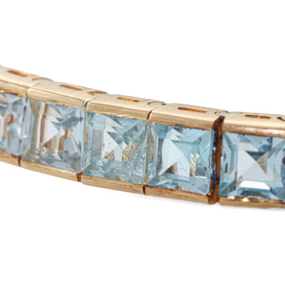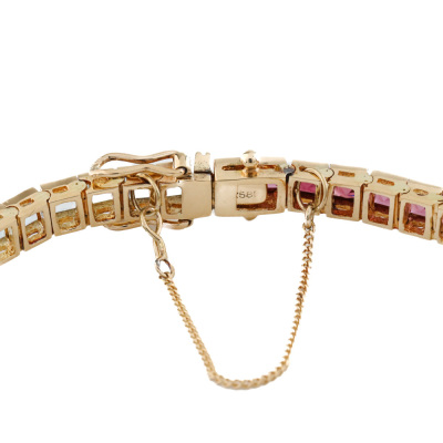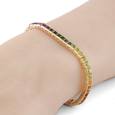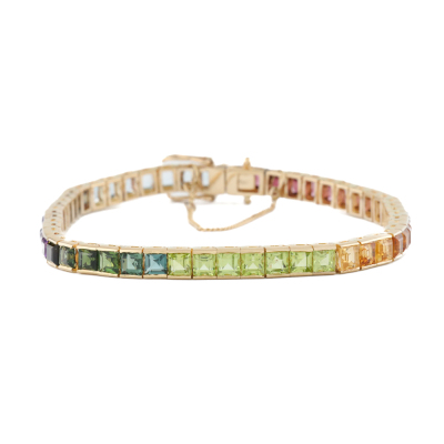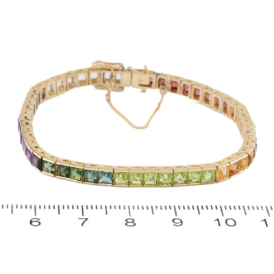 Multi-colour Gemstone bracelet with 53 carre cut Natural Gemstones totalling approximately 9.50ct Gemstone including blue Topaz, Amethysts, green Tourmalines, Citrine and pink Tourmalines). 14ct yellow gold with 18ct safety chain. Length: 17cm with 4.5cm safety chain. Weight: 12.9g. (Pre-owned)