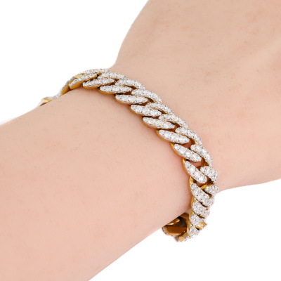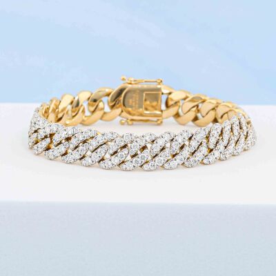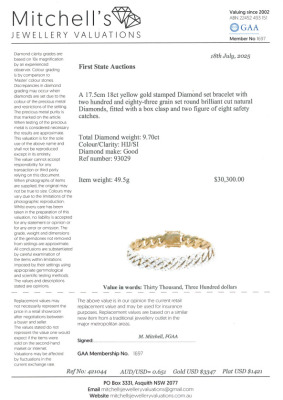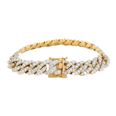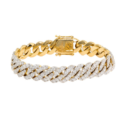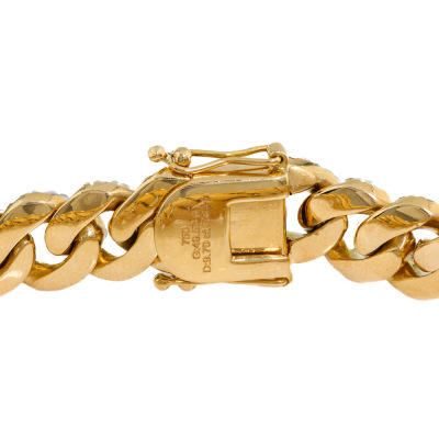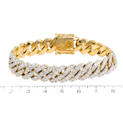 Cuban link chain bracelet with 283 round Natural Diamonds totalling 9.70ct (Estimated grading: HIJ SI). 18ct yellow gold. Length: 17.5cm. Width: 10.8mm Weight: 49.5g. With Valuation Certificate #421044. (Pre-owned)