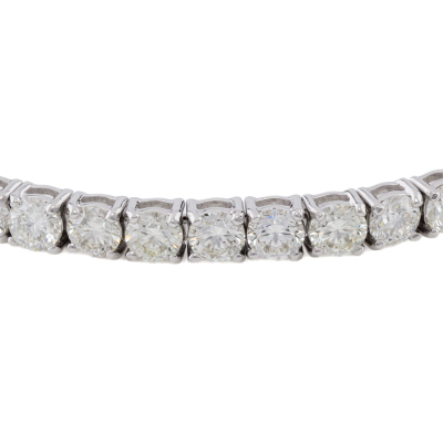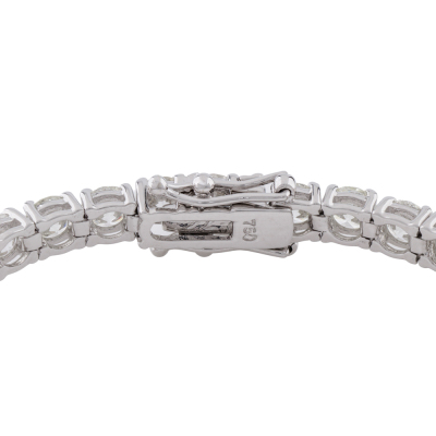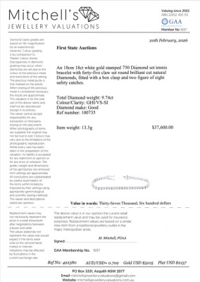 Diamond tennis bracelet with 45 round Natural Diamonds totalling 9.74ct (Estimated grading: GHI VS-SI). 18ct white gold. Length: 18cm. Weight: 13.5g. With Valuation Certificate #422580.