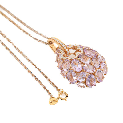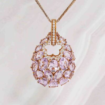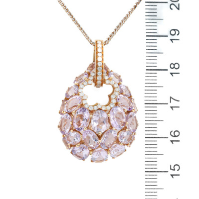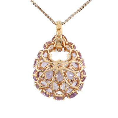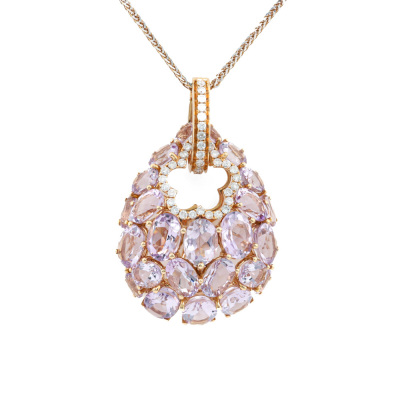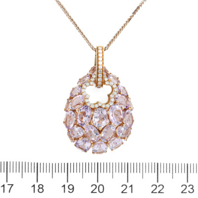 Amethyst and Diamond enhancer pendant with oval shape Natural light purple Amethyst totalling 9.86ct and round Natural Diamonds totalling 0.36ct (Estimated grading: I-J P1). 18ct rose gold with 45cm 18ct rose gold chain. Weight: 9.8g. (Pre-owned)