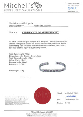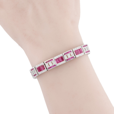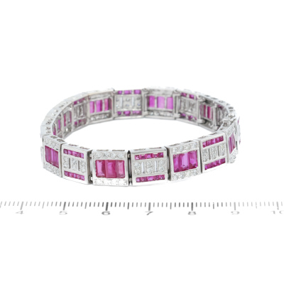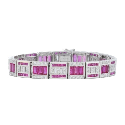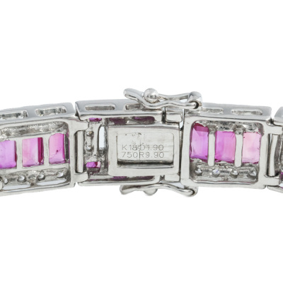 Ruby and Diamond bracelet with baguette & carre cut Natural Rubies totalling 9.90ct and round Natural Diamonds totalling 1.90ct (Estimated grading: H-I P1). 18ct white gold. Length: 18cm. Width: 8.6mm. Weight: 28.8g. With Certificate #421496. (Pre-owned)