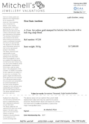 Belcher link chain bracelet with bolt clasp. 9ct yellow gold. Length: 21cm. Width: 9.9mm. Weight: 50.9g. With Valuation Certificate #421798. (Pre-owned)