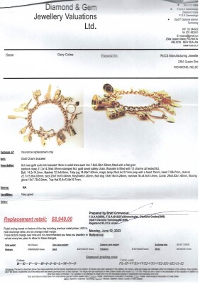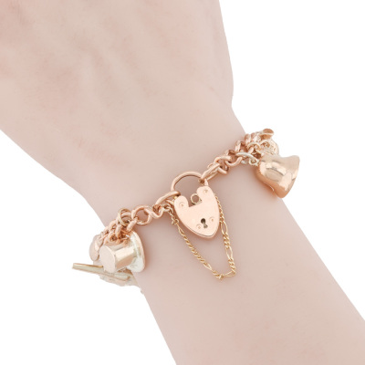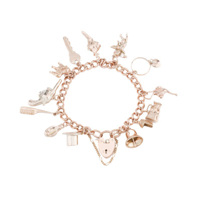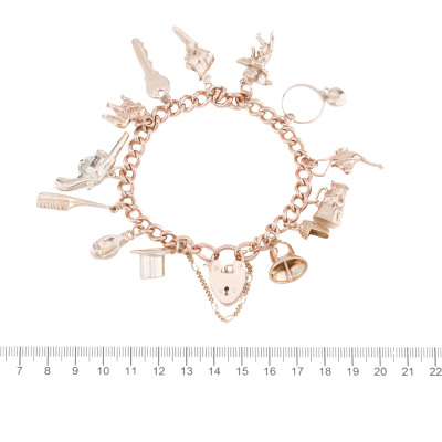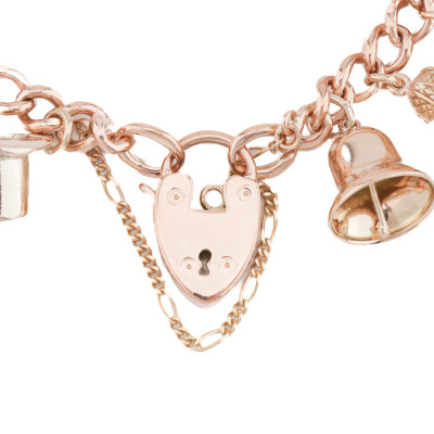 Charm Bracelet with heart padlock and 13 charms (Please refer to Valuation Certificate for full details). 9ct rose gold chain & padlock with 9ct rose gold & 9ct yellow gold charms. Length: 18cm with safety chain of 7.5cm. Weight: 59.3g. With Valuation Certificate 12/06/2023. (Pre-Owned)
