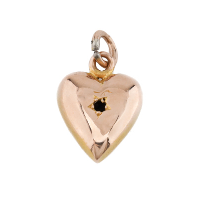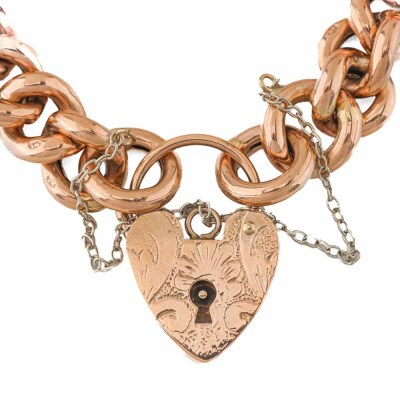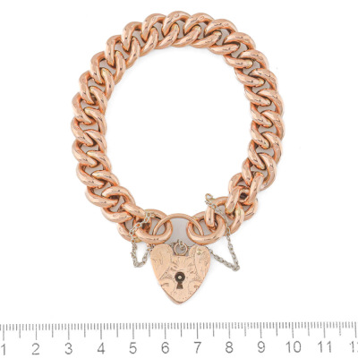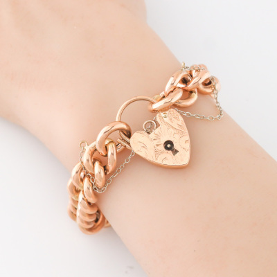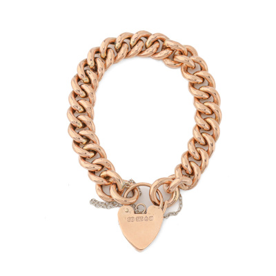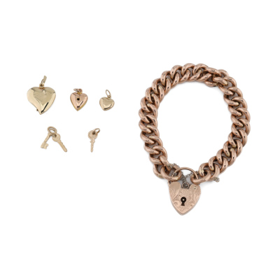 Bracelet and Charms set. 1) 9ct rose gold curb link bracelet with padlock closure and 925 silver safety chain. Length: 20cm. 2) Set of 5 gold charms with 3 hearts (One heart charm with a missing stone) and 2 keys. 9ct yellow gold (2 Heart charms & 2 key charms) and 9ct rose gold. Total weight: 40.2g. (Pre-owned)