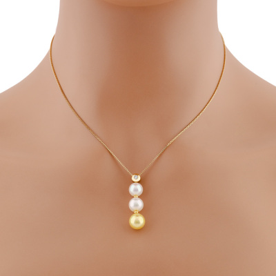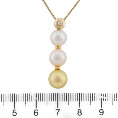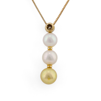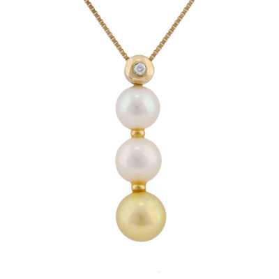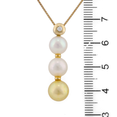 Pearl and Diamond drop pendant with a 3 Akoya Pearls from 8.7mm - 7.8mm and a round Natural Diamond of 0.04ct. 18ct yellow gold with 36.5cm - 40cm 18ct yellow gold adjustable chain. Weight: 5.2g.