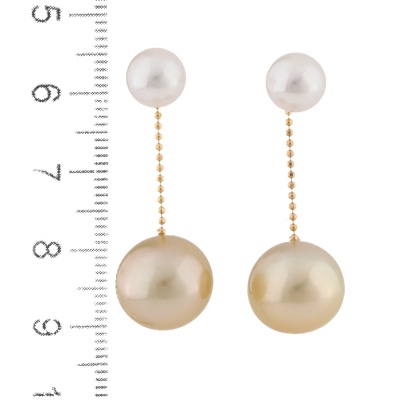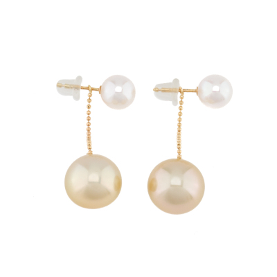 Detachable Pearl drop earrings with Akoya Pearls stud tops of 7.6mm and detachable 2 Golden South Sea Pearl drops of 12.4mm. 18ct yellow gold with silicon backs. Drop length: 3.5cm. Weight: 7.1g. (Pre-owned)