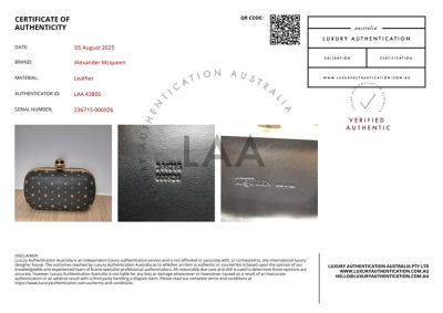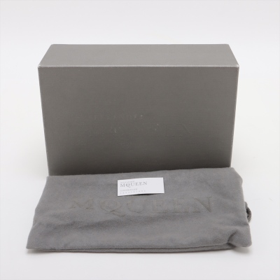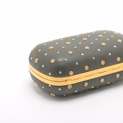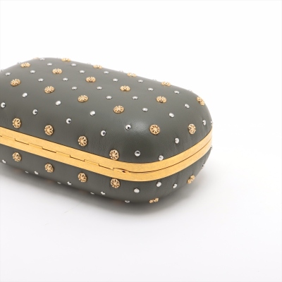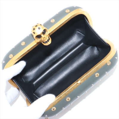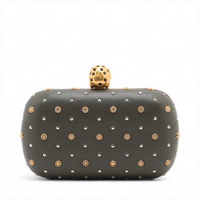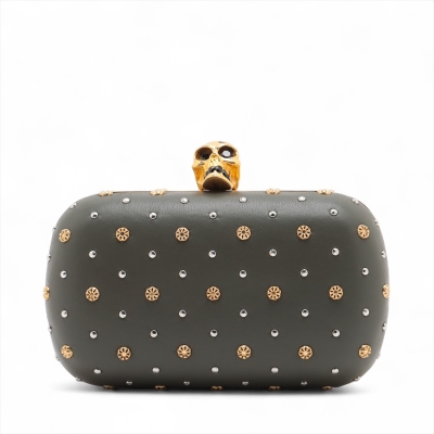 Alexander McQueen Studded Skull Clutch bag in grey leather. Featuring antique gold-toned hardware, stud embellishments along body of bag, and skull designed clasp closure. This opens to a black leather interior. Approximate dimensions: 16cm(L) x 9cm(H). Accompanied by Alexander McQueen dustbag and box. With Luxury Authentication Australia Certificate of Authenticity. (Pre-owned)