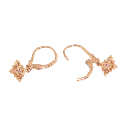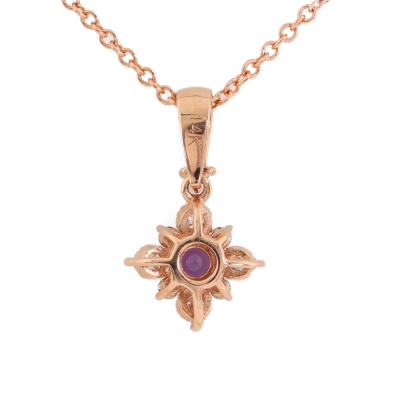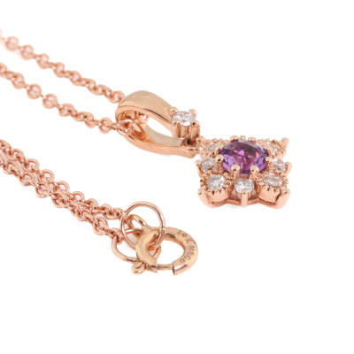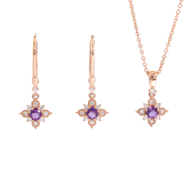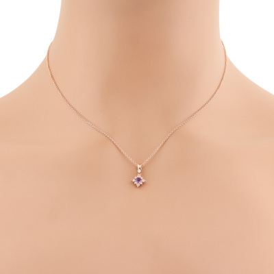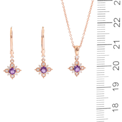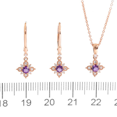 Pendant and earrings set. 1) Amethyst and Diamond Pendant with centre round Natural Amethyst of 0.11ct and round Natural Diamonds totalling 0.09ct. Length: 40cm. 2) Matching leverback earrings with round Natural Amethyst totalling 0.22ct and round Natural Diamonds totalling 0.16ct. Both 14ct rose gold. Total weight: 3.2g. (New)
