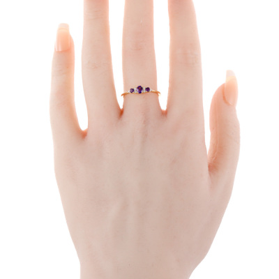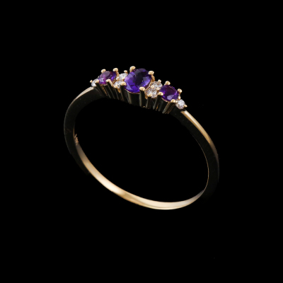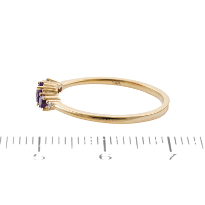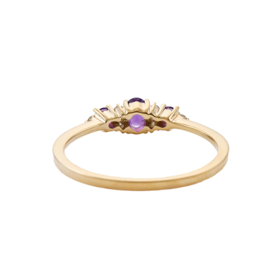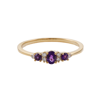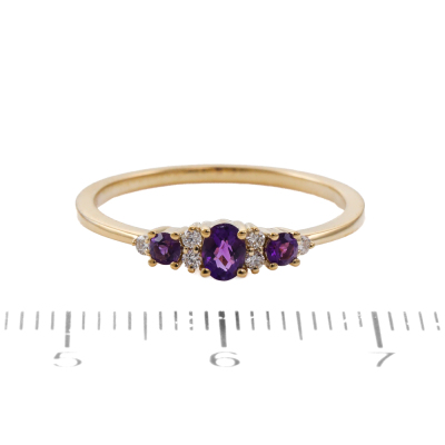 Amethyst and Diamond ring with oval centre Natural Amethyst of 0.13ct, round Natural Amethysts totalling 0.08ct and round Natural Diamonds totalling 0.07ct. 14ct yellow gold. Ring size: N1/4. Band width: 1.2. Weight: 1.6g. (New)