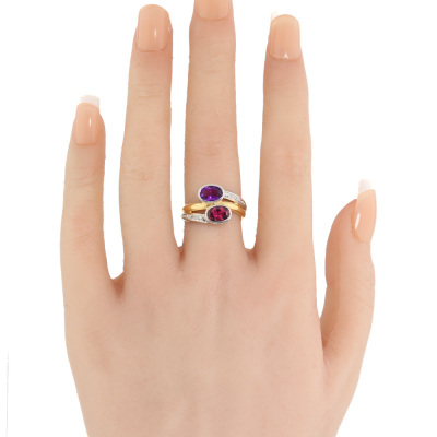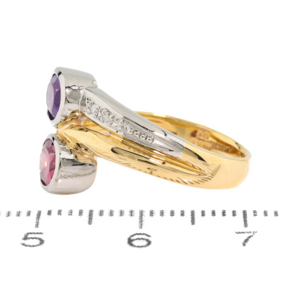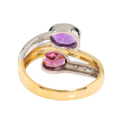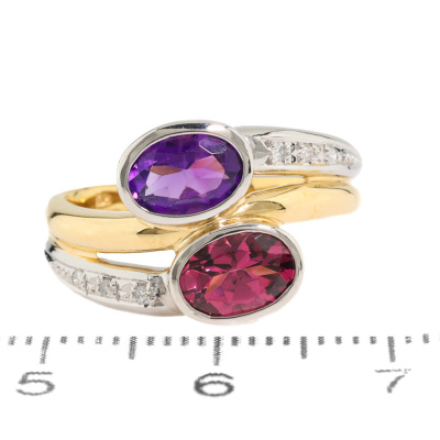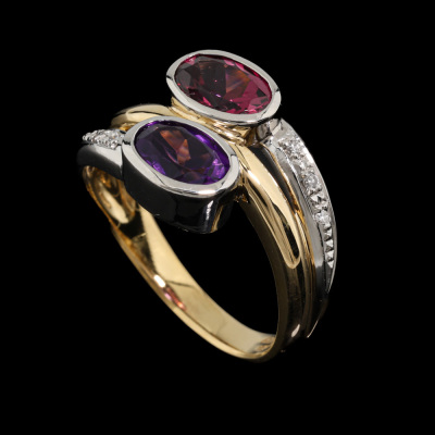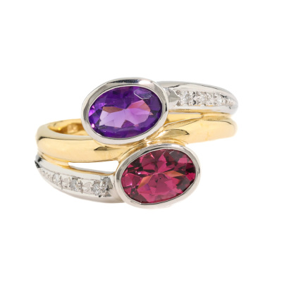 Toi et Moi ring with oval shape Natural Amethyst of approximately 0.70ct, oval shape Natural Red Garnet of approximately 1.00ct and round Natural Diamonds totalling approximately 0.03ct. Platinum - 900 and 18ct yellow gold. Ring size L1/4. Band width: 2.7mm - 3.7mm. Weight: 5.2g. (Pre-owned)