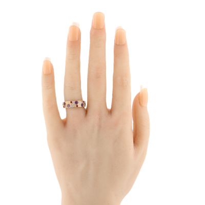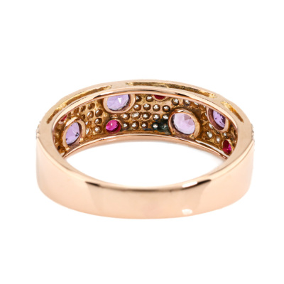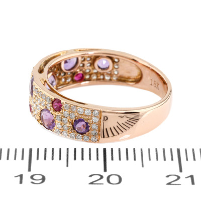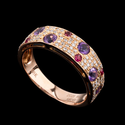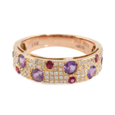 Amethyst, Ruby and Diamond ring with round Natural Amethyst totalling 0.49ct, round Natural Rubies totalling 0.11ct and round Natural Diamonds totalling 0.28ct. 18ct rose gold. Ring size L3/4. Band width: 3.4mm - 5.0mm. Weight: 3.6g. (Pre-owned)