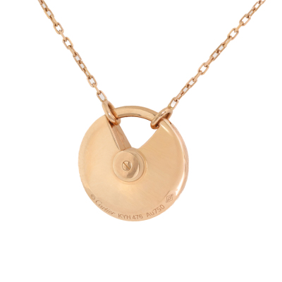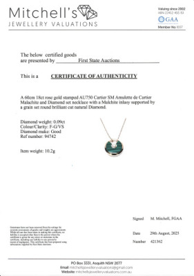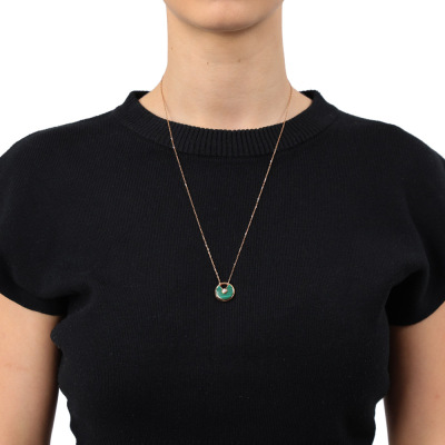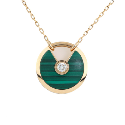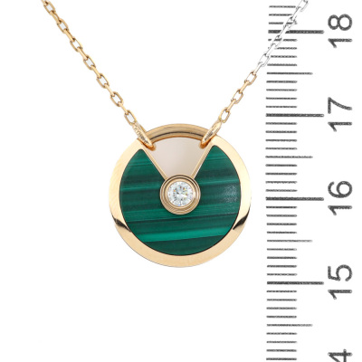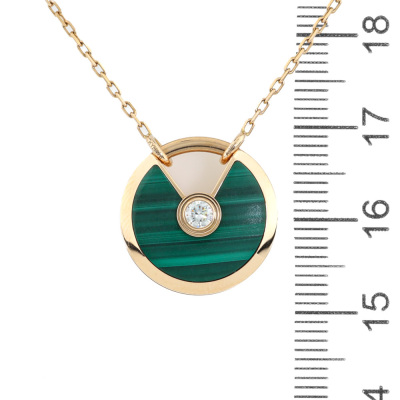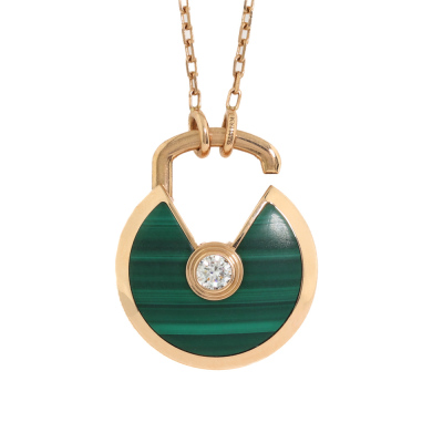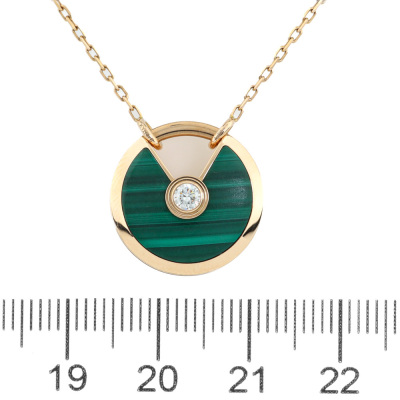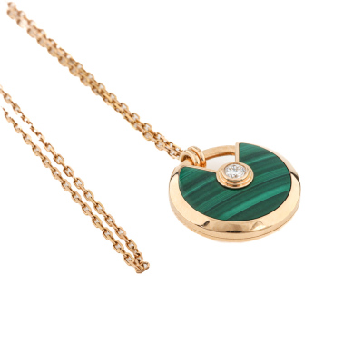 Amulette de Cartier Necklace, SM model with Malachite inlay and round Natural Diamond of approximate 0.09ct. Motif size: 1.7cm. 18ct rose gold with Cartier 18ct rose gold chain. Inner circumference: 60cm. Weight: 10.2g. With Cartier inner & outer box. With Certificate #421362. (Pre-owned)