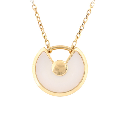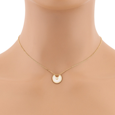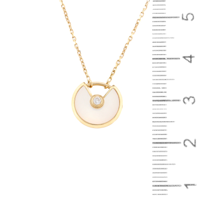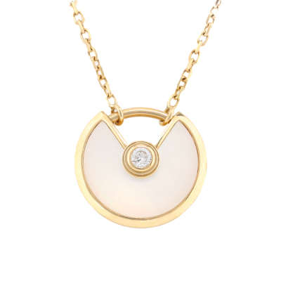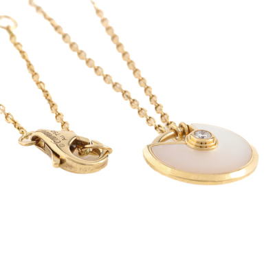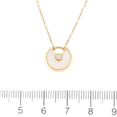 Amulette de Cartier XS model Mother of Pearl and Diamond pendant with round Natural Diamond of approximately 0.02ct. Motif size: 12mm. 18ct yellow gold with Cartier 38cm - 41cm 18ct yellow gold adjustable chain. Weight: 2.9g. (Pre-owned)