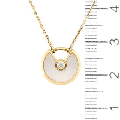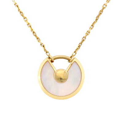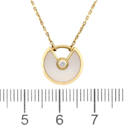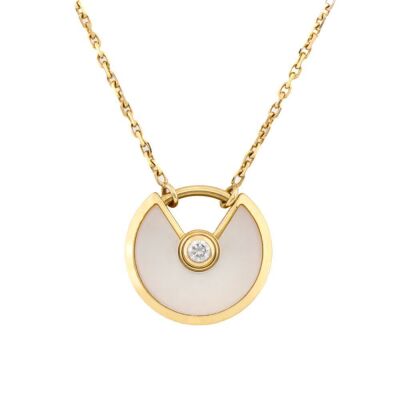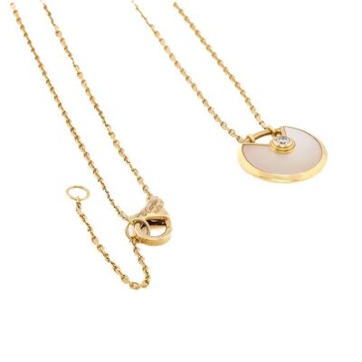 Amulette de Cartier XS model Mother of Pearl and Diamond pendant with round Natural Diamond of approximately 0.02ct. Motif size: 12mm. 18ct yellow gold with Cartier 38cm - 41cm 18ct yellow gold adjustable chain. Weight: 3.1g.